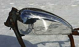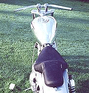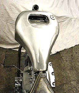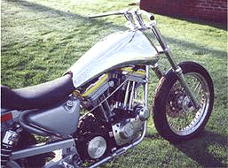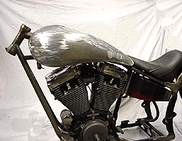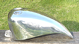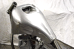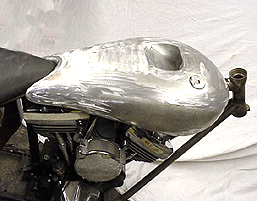 Triple curvatured, one-off, Sportster tank. Mini aircraft filler, oblong Dakota speedo recess and hidden rubber mounts. This tank is just to show you what can be done with a bit of imagination!