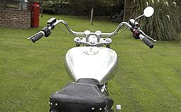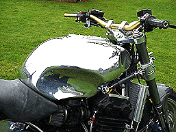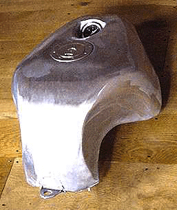 Triple curvatured, one-off, Sportster tank. Mini aircraft filler, oblong Dakota speedo recess and hidden rubber mounts. This tank is just to show you what can be done with a bit of imagination!