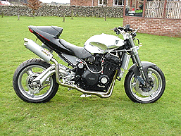 This is Marks TL1000L tank. As you can see Mark has fitted a TL1000 seat. We have manufactured this as a one-off tank to suit the Triumph frame: £550. Mark has chosen the works type double filler which adds another £100 to the cost. This is another example of the one-offs I enjoy making to make your bike that bit special.